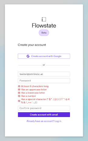 - Set up your authentication credentials. There are two main options for signing in to Flowstate: (a) enter your email address and a password of your choice, or (b) authenticate with a Google account.
