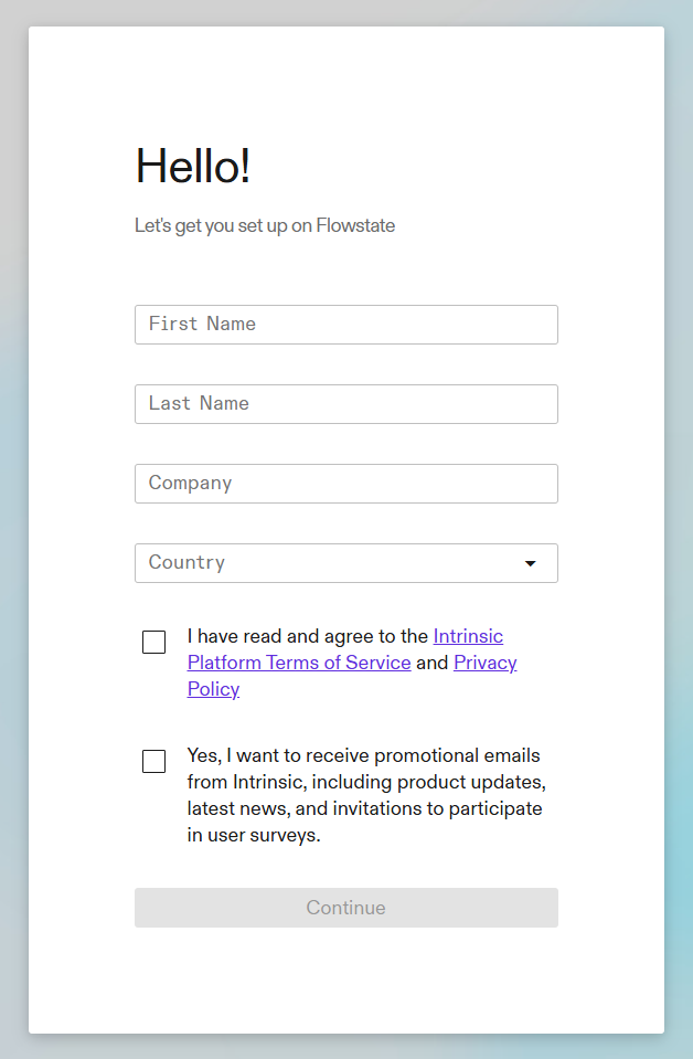 - Set up your account. The following fields are required: full name, country, and agreeing to the Platform Terms of Service and Privacy policy. It is optional to join our marketing and survey email lists; however, we recommend joining to stay up-to-date on the latest Flowstate features, capabilities, and events.