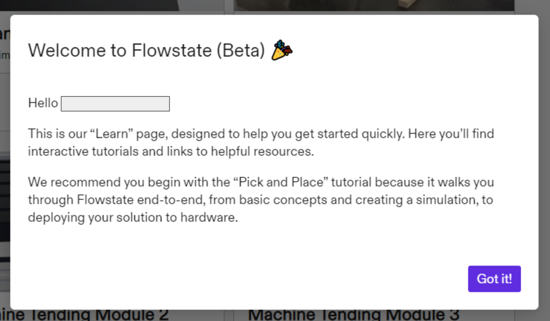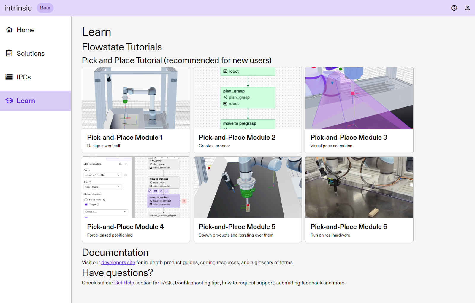 - You’ll be dropped off on the Learn page, which highlights tutorials from our developer documentation site. We recommend you start with Pick and Place Module 1. When clicked, the tutorial will open in a new browser tab. The Learn page is always accessible from the left (navigation) panel.