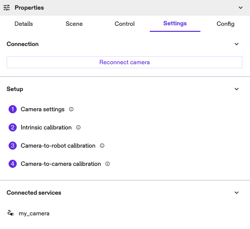 - In the Properties panel on the left side of the screen, under Settings, select the Camera-to-robot calibration option.